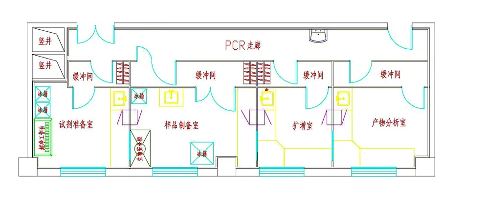 PCR實驗室原則上為試劑準備區、樣品制備區、擴增區和擴增產物分析區四個單獨的工作區域并設有專用走廊,各工作區域應設緩沖間,工作區與緩沖間宜安裝連鎖裝置。不同功能的工作區應是分隔獨立的,各工作區有明顯的標志,不能直通,如果緊密相連,需安裝物品傳遞窗。